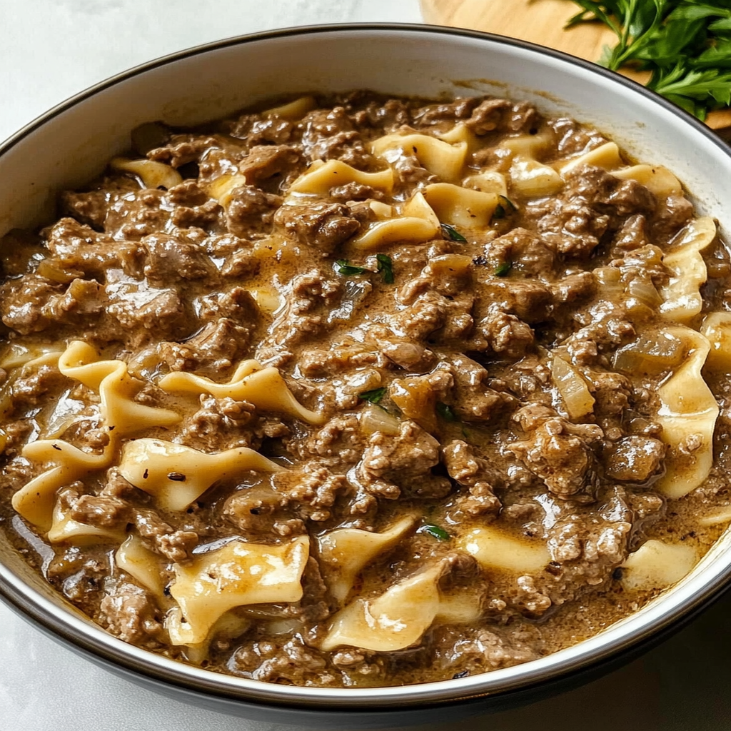 Start by browning the ground beef in a skillet over medium heat. Once browned, remove it and sauté onions and mushrooms until tender. Add garlic, then return the beef to the pan. Finally, stir in your creamy sauce ingredients to create a deliciously rich dish.