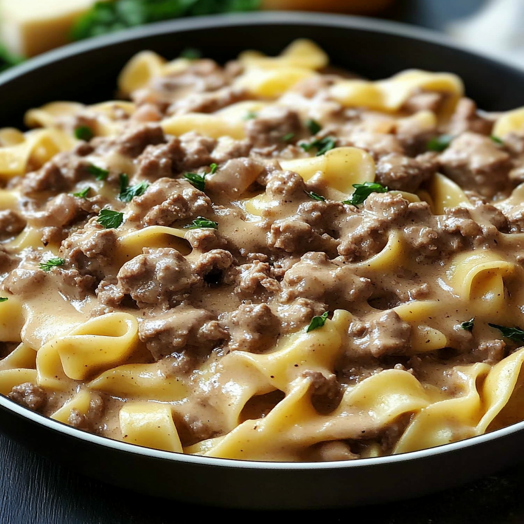 Begin by browning the ground beef in a skillet until it's nicely caramelized. While that's happening, you can cook your egg noodles in a separate pot. Once both are ready, combine them with the creamy sauce for a seamless experience.