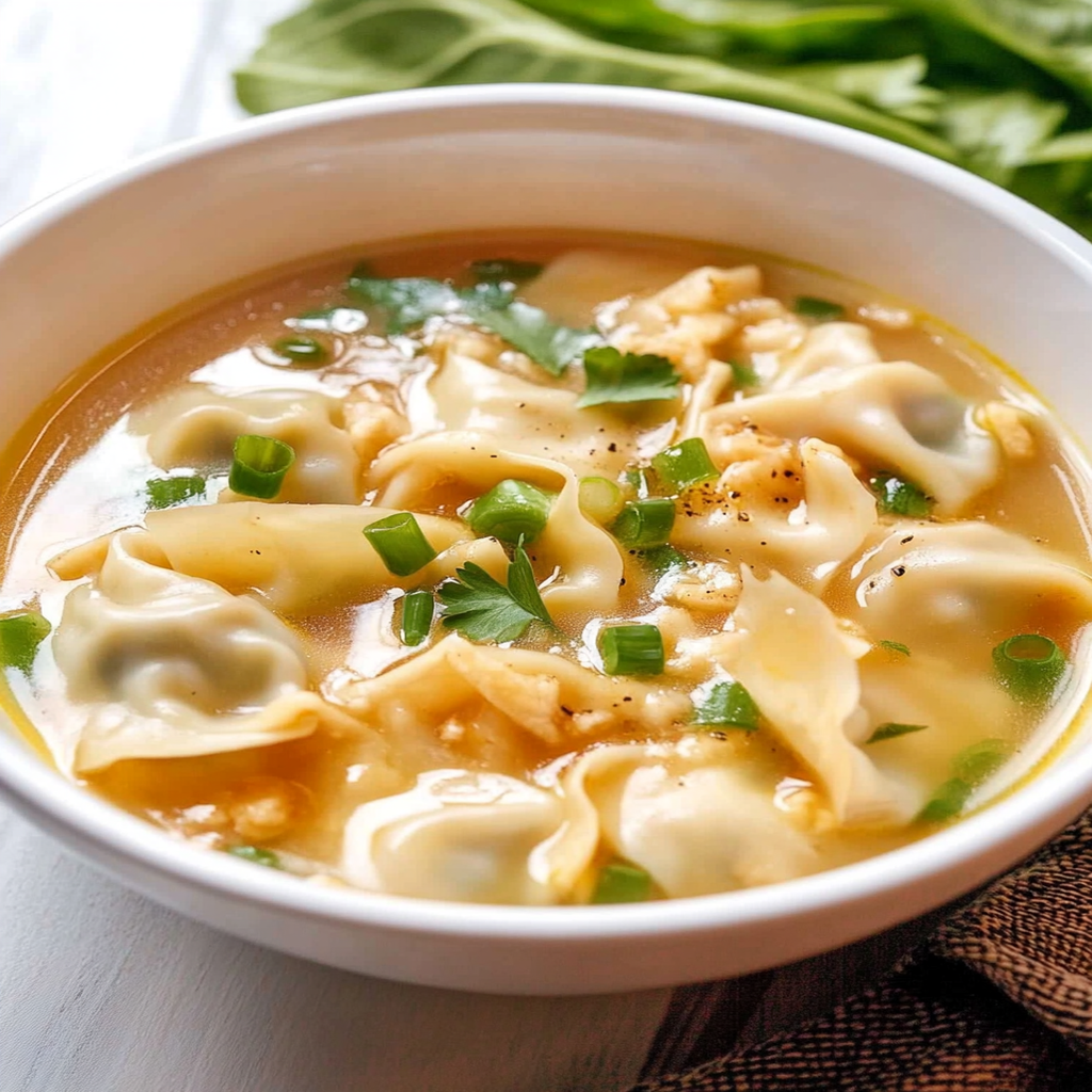 Savor the comforting warmth of this Quick & Easy Wonton Soup, perfect for busy weeknights or cozy evenings. Tender wontons filled with your choice of meat or vegetables float in a savory chicken broth infused with garlic and ginger, topped with fresh green onions. This simple yet satisfying dish can be prepared in under 30 minutes and customized to suit your taste preferences. Enjoy a bowl of warmth that wraps you in comfort with every slurp!
